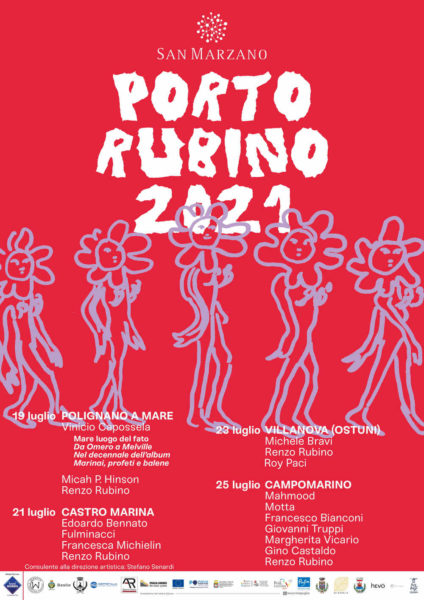 Tanti i compagni di viaggio di Renzo e gli ospiti d’eccezione: da Polignano a Mare (BA) il 19 luglio con Vinicio Capossela e Micah P. Hinson, si sbarcherà a Castro Marina (LE) il 21 luglio con Edoardo Bennato, Francesca Michielin e Fulminacci; dall’alba del 23 luglio a Ostuni – Villanova (BR) con Michele Bravi e Roy Paci, si approderà il 25 luglio alla grande festa finale di Maruggio – Campomarino (TA) con Mahmood, Francesco Bianconi, Giovanni Truppi, Margherita Vicario, Motta e Gino Castaldo. Porto Rubino rafforzerà ulteriormente il suo legame con il territorio pugliese dando la possibilità a tre giovani artisti locali, i cui nomi verranno svelati in seguito, di aprire una o più tappe dell’evento, grazie ad un accordo in via di definizione con Regione Puglia, Puglia Sounds/Teatro Pubblico Pugliese e Puglia Promozione.