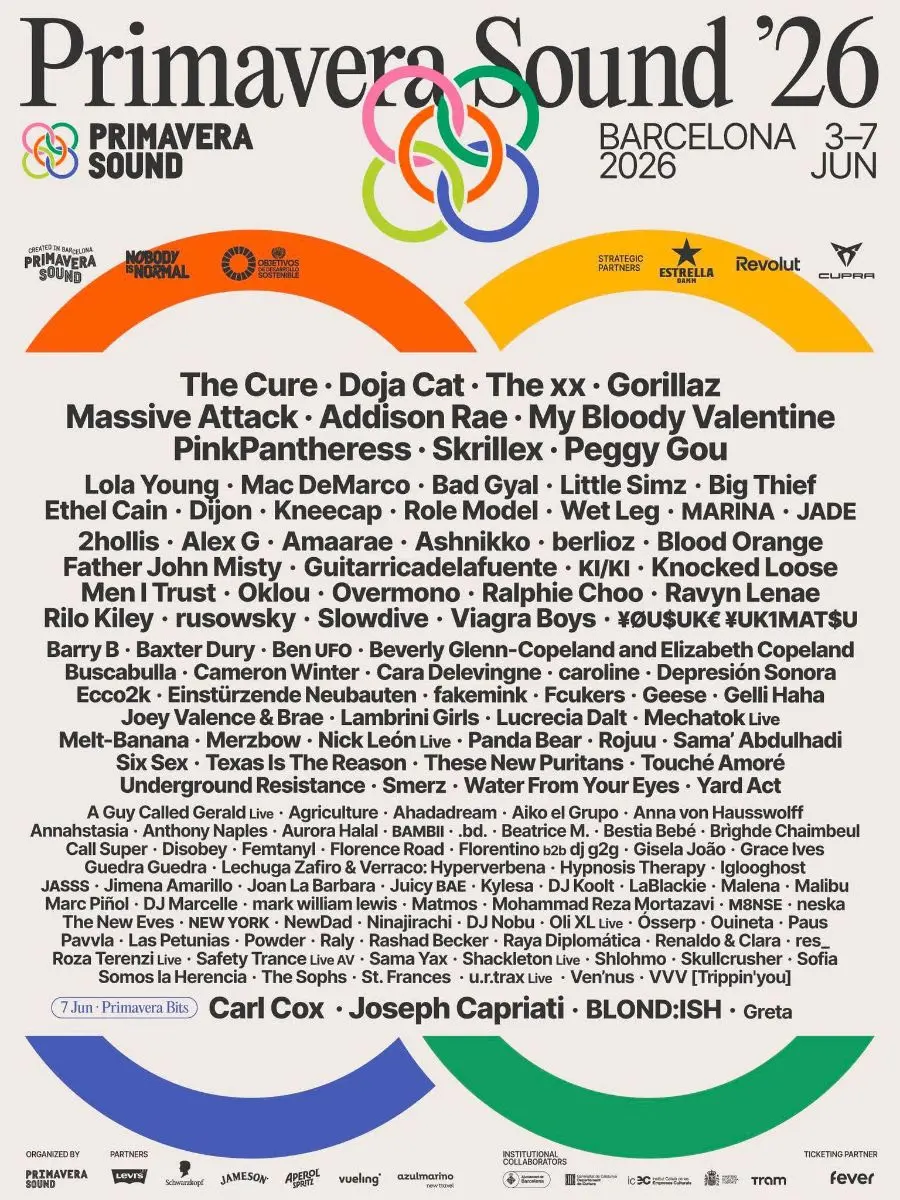 Primavera Sound Barcellona 2026 è supportato da Estrella Damm, Revolut e CUPRA come partner strategici principali. Il loro sostegno rende possibile continuare a migliorare il festival, in cui crediamo profondamente, sia a livello musicale sia in tutto ciò che lo circonda. A loro si aggiunge la collaborazione essenziale di Levi’s, Schwarzkopf, Jameson, Aperol, Vueling e azulmarino, e di Fever come punto vendita ufficiale. Grazie di cuore a tutti per la fiducia riposta in Primavera Sound.