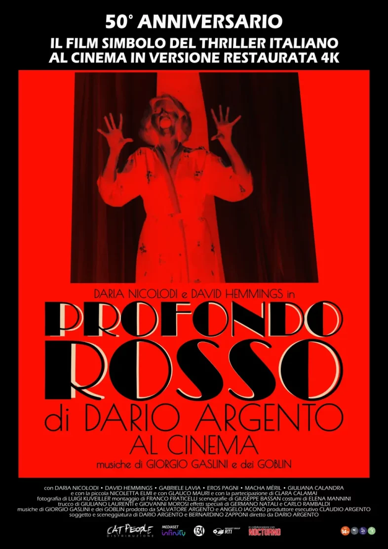 Interpretato da Daria Nicolodi, David Hemmings e Gabriele Lavia, il film deve parte del suo fascino immortale anche alla celebre colonna sonora firmata da Giorgio Gaslini e dai Goblin di Claudio Simonetti. Un’opera rivoluzionaria, in cui Argento destruttura il genere che lui stesso aveva contribuito a definire, trasformandolo in un incubo frammentato, libero e anarchico, capace di generare un’inquietudine senza tempo.