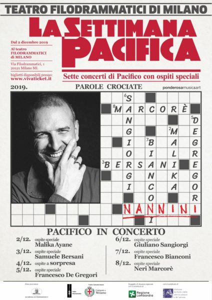 “LA SETTIMANA PACIFICA” proseguirà fino a domenica 8 dicembre al Teatro Filodrammatici di Milano. Dopo MALIKA AYANE (2 dicembre), SAMUELE BERSANI (3 dicembre), GIANNA NANNINI (4 dicembre), FRANCESCO DE GREGORI (questa sera), GIULIANO SANGIORGI (domani sera), i prossimi ospiti che PACIFICO accoglierà sul palco sono FRANCESCO BIANCONI (7 dicembre) e NERI MARCORÈ (8 dicembre).