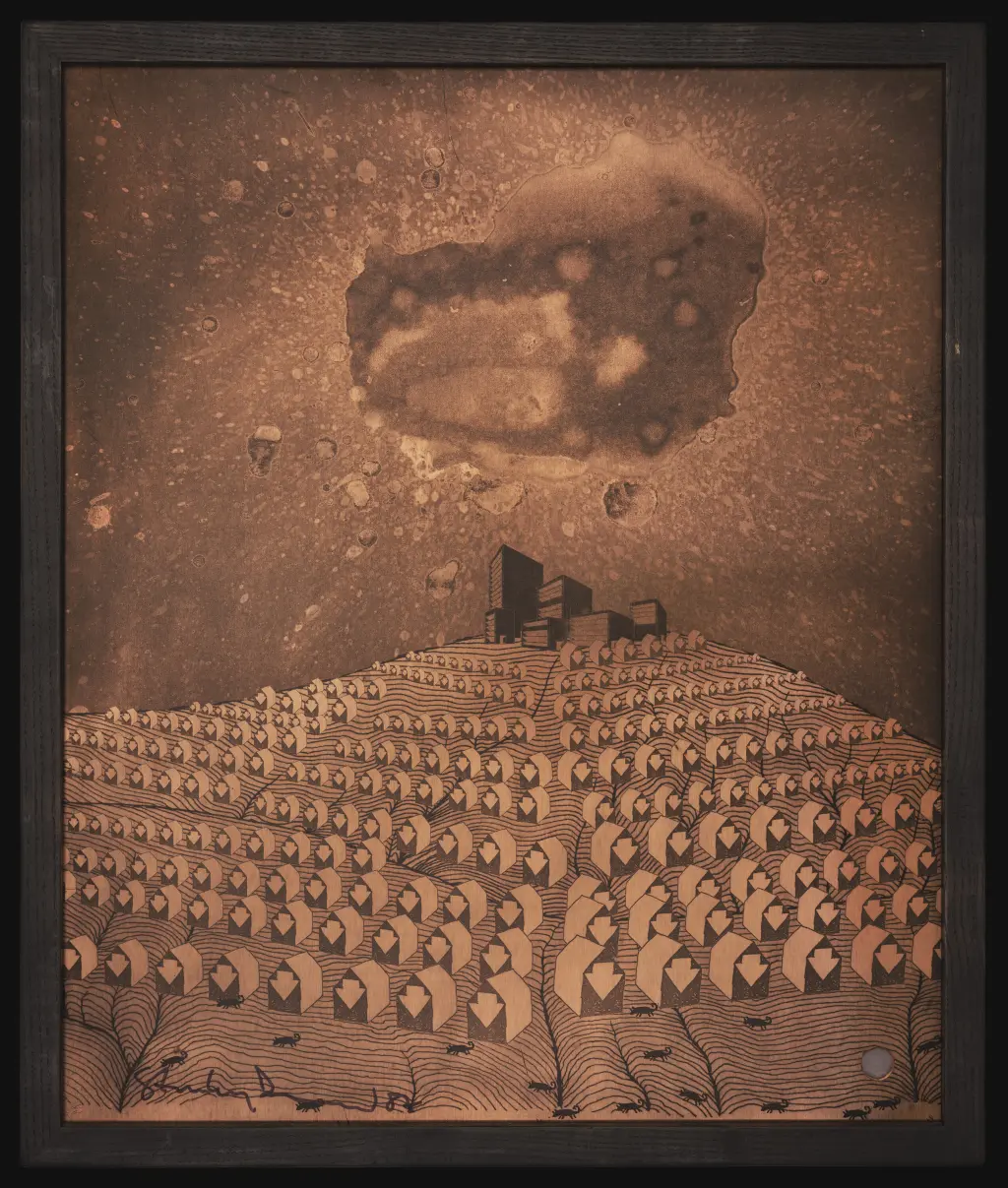 Attraverso materiali, stili e formati molto diversi, il lavoro di Yorke e Donwood si confronta con il paesaggio in senso ampio: città, sobborghi, campagne, paesaggi lunari e onirici, attualità e stati psichici, sempre in dialogo con il suono unico di ogni progetto. La loro arte offre un’esperienza estetica e psicologica intensa, attraversata dall’ansia per ciò che stiamo perdendo a causa di stili di vita ecologicamente insostenibili. La linoleografia di Donwood per The Eraser (2006), esordio solista di Yorke, si ispira all’alluvione di Boscastle in Cornovaglia: mostra Londra sommersa da un’enorme onda scura, mentre una figura solitaria lancia un comando vano al mare. The King of Limbs (2011) nasce invece dal paesaggio magico di Wistman’s Wood, con i suoi alberi antichi. Per entrambi, disegnare alberi è un gesto “meditativo” o addirittura “dipendenza”.