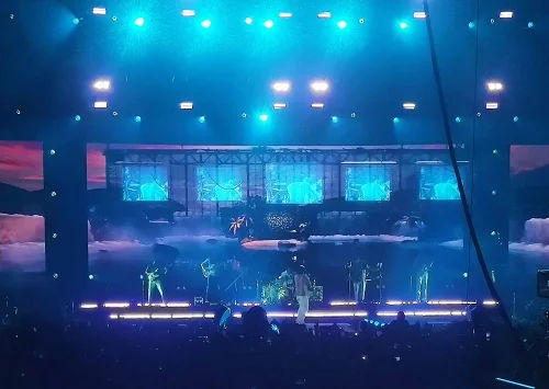 Il concerto si avvale, fin dal suo inizio, di una nutrita serie di visual, immagini colorate, che scorrono su un maxi schermo alle spalle della band. Arricchiscono il tutto fuochi d’artificio, luci laser, un palco che sale e scende come già visto per il live dei Subsonica (Leggi qui) e le spettacolari bacchette della batteria infuocate con cui il batterista Matteo Locati percuote i tamburi al termine della parte acustica, per il rientro in band.