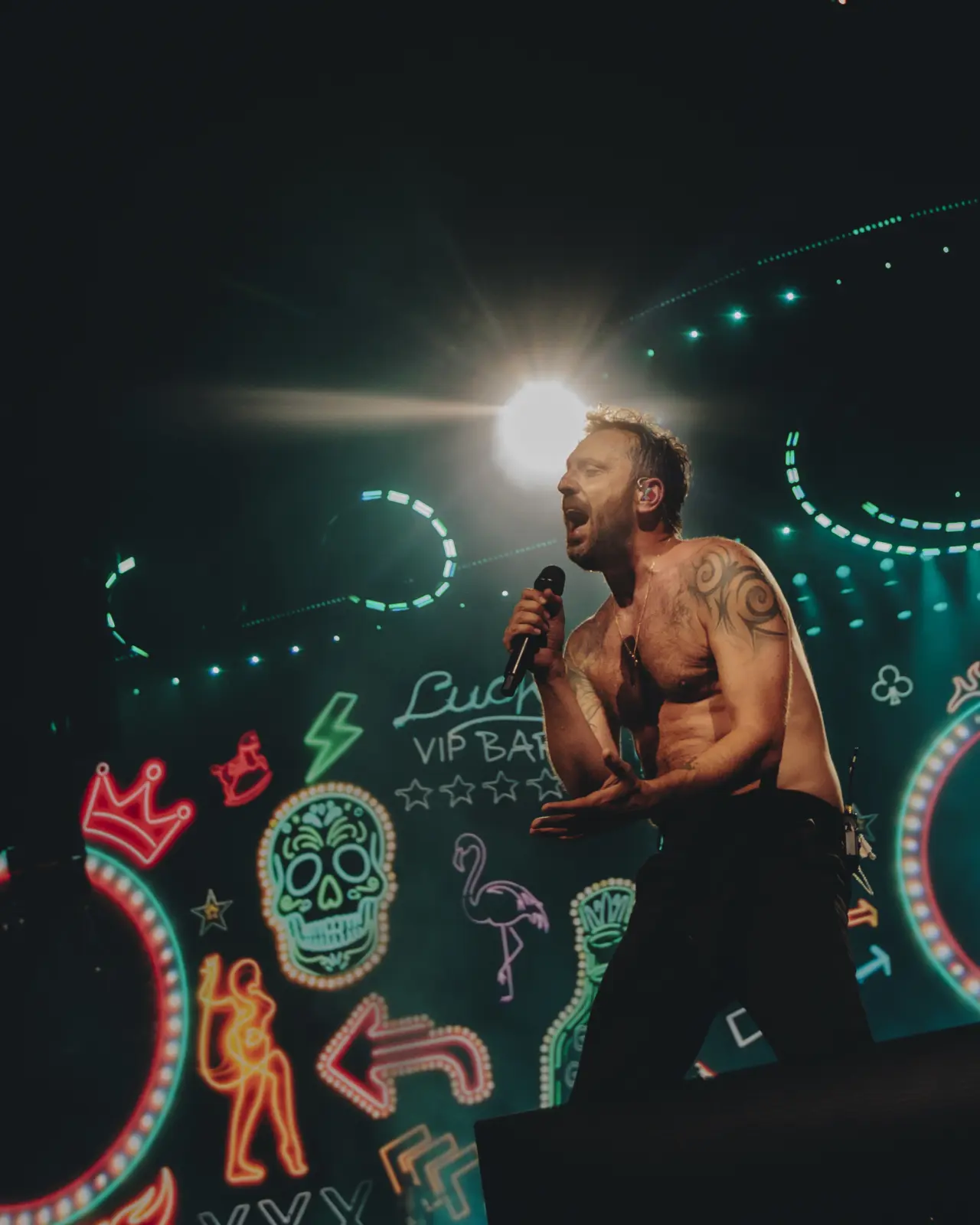 Il progetto luci firmato da Mamo Pozzoli è pensato come estensione della musica. Oltre 600 proiettori LED, strutture circolari motorizzate e una palette cromatica studiata sin dall’inizio danno vita a uno spazio in continua metamorfosi, dove la luce si fa racconto.