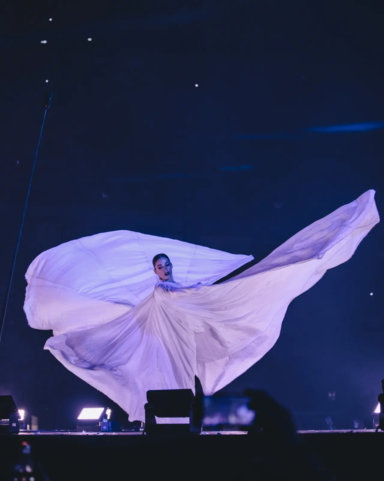 Il palco lo attraversa, lo percorre, lo canta, lo coccola. Ne fa una casa, un’estensione della propria pelle. Con La ragazza del futuro, la narrazione si fa visione: al centro della scena compare una figura simbolica, quasi mitologica, mentre le luci e la coreografia amplificano le suggestioni del brano. Musica e immaginazione si fondono in un’installazione vivente.