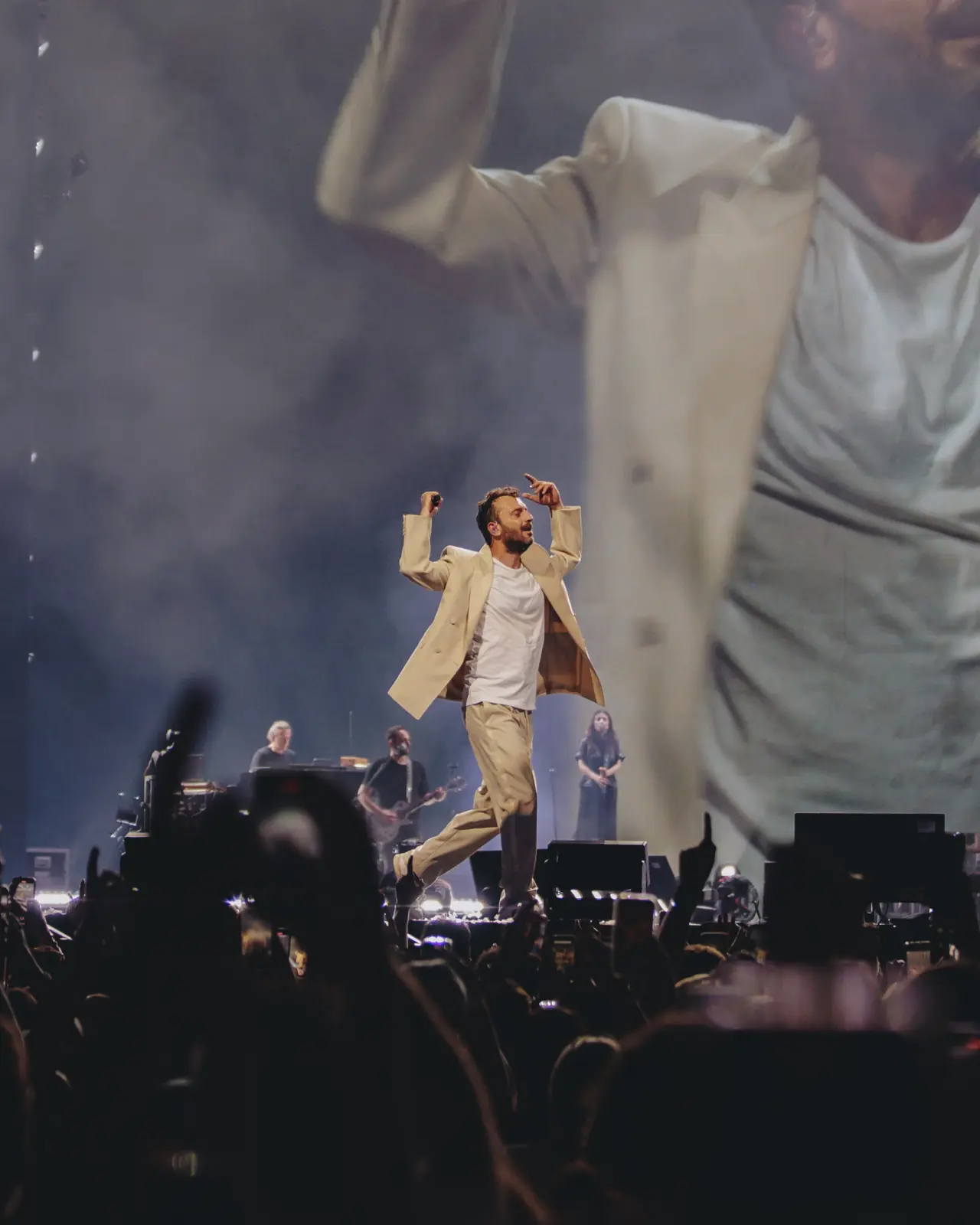 I concerti di Cremonini non sono mai lasciati al caso. Complessi ma per questo non complicati. Una concettualità di base che anche questa sera attraversa tutto lo show e ci immerge in un viaggio, quello sonoro e di vita, di Cesare dove la musica è tenuta con l’ausilio di arte varia: musica, performance, luci, visual a rappresentare.