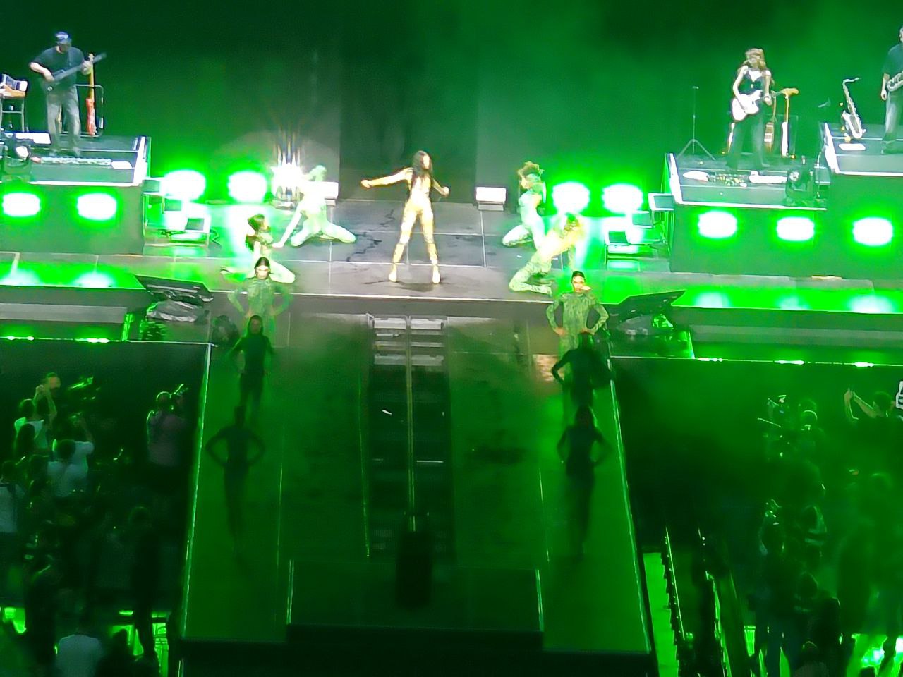 In un SanSiro pieno ma non pienissimo Elodie si muove su un palco essenziale: due maxi schermi laterali, uno centrale e una serie di pedane ascendenti e set con anche due vasche al centro della scena. Attorno, la band composta da tre coriste, fiati, batteria, chitarre, basso e tastiere. E da non dimenticare un super corpo di ballo che la segue e con lei crea la magia dello show.