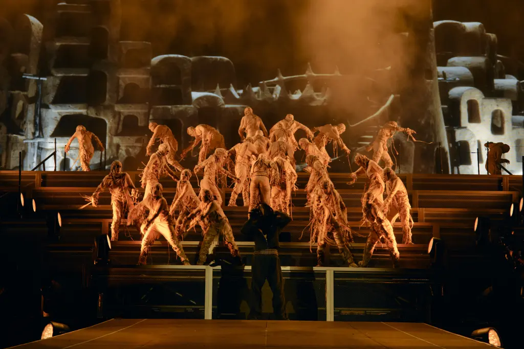 La regia di Mohamed Sqalli ha costruito intorno a Ghali un mosaico di riferimenti che va da Fellini a Ziegfeld, dal circo classico al Sud Globale. I 36 ballerini e l’orchestra araba non sono appoggi scenici, ma pezzi di un racconto corale che allarga lo spettro dello show e mette in dialogo identità, simboli e musica.