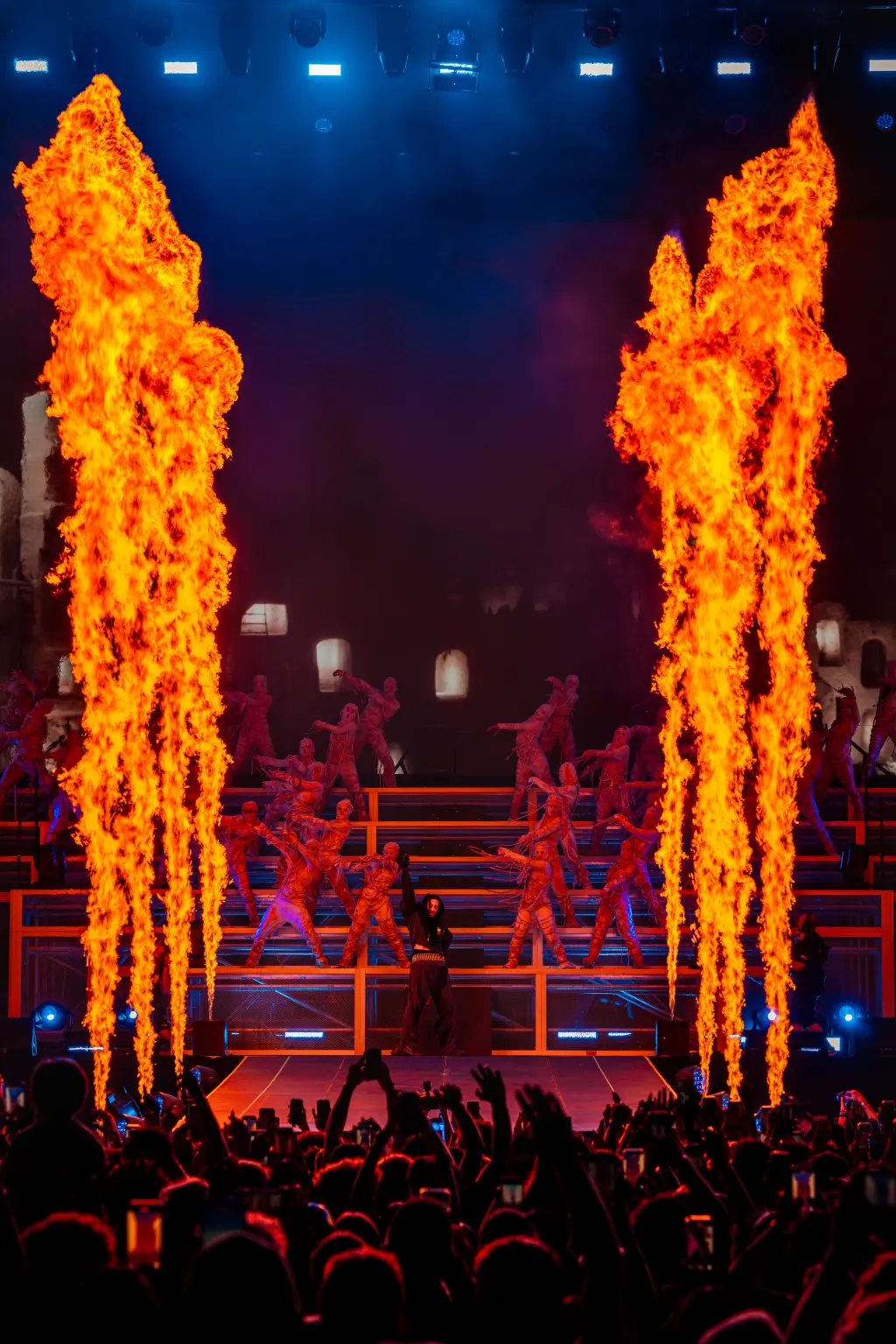 La regia di Mohamed Sqalli ha costruito intorno a Ghali un mosaico di riferimenti che va da Fellini a Ziegfeld, dal circo classico al Sud Globale. I 36 ballerini e l’orchestra araba non sono appoggi scenici, ma pezzi di un racconto corale che allarga lo spettro dello show e mette in dialogo identità, simboli e musica.