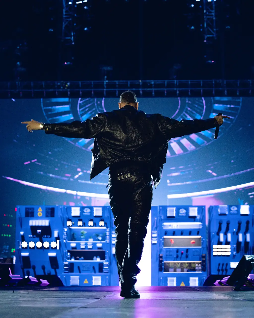 Per il suo esordio negli stadi Marracash mette in scena uno spettacolo impressionate, in cui musica, teatralità e concetti si tengono tra loro. La musica (suonata da una band) è una parte di un tutto, perché sul palco, addobbato come una cabina di regia di un sistema di computer (la “capsula” il suo alter ego con cui Marra “dialoga”), succedono molte cose, tante e differenti che raccontarle diventa difficile. Non manca nulla per fare spettacolo: ballerini/mimi con le loro coreografie, fiamme, fuochi d’artificio, visual, scenografia, luci, teatro con la recitazione e anche una citazione di Frankie Hi NGR.