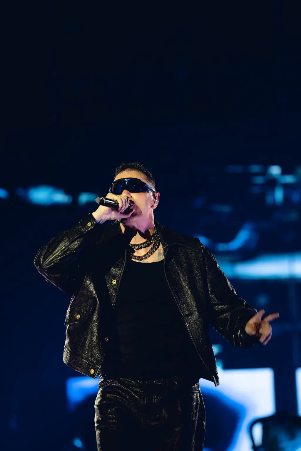 Per il suo esordio negli stadi Marracash mette in scena uno spettacolo impressionate, in cui musica, teatralità e concetti si tengono tra loro. La musica (suonata da una band) è una parte di un tutto, perché sul palco, addobbato come una cabina di regia di un sistema di computer (la “capsula” il suo alter ego con cui Marra “dialoga”), succedono molte cose, tante e differenti che raccontarle diventa difficile. Non manca nulla per fare spettacolo: ballerini/mimi con le loro coreografie, fiamme, fuochi d’artificio, visual, scenografia, luci, teatro con la recitazione e anche una citazione di Frankie Hi NGR.