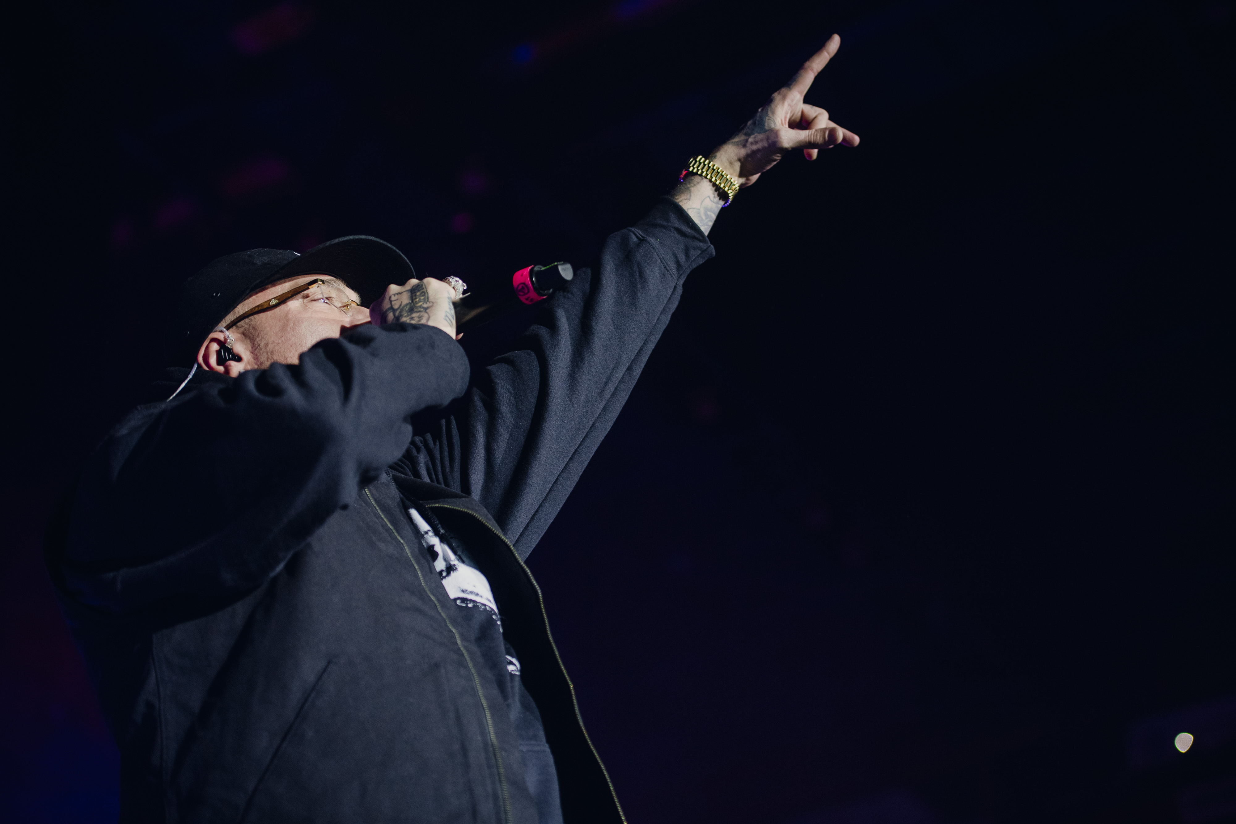 Un concerto come le grandi produzioni. Non c’era una band ma il dj con le basi anche se in una parte del set ha suonato con una vera e propria band i 72 Hours Post Fight e in altre canzoni c’erano le chitarre e addirittura il sax a contorno delle sue barre.