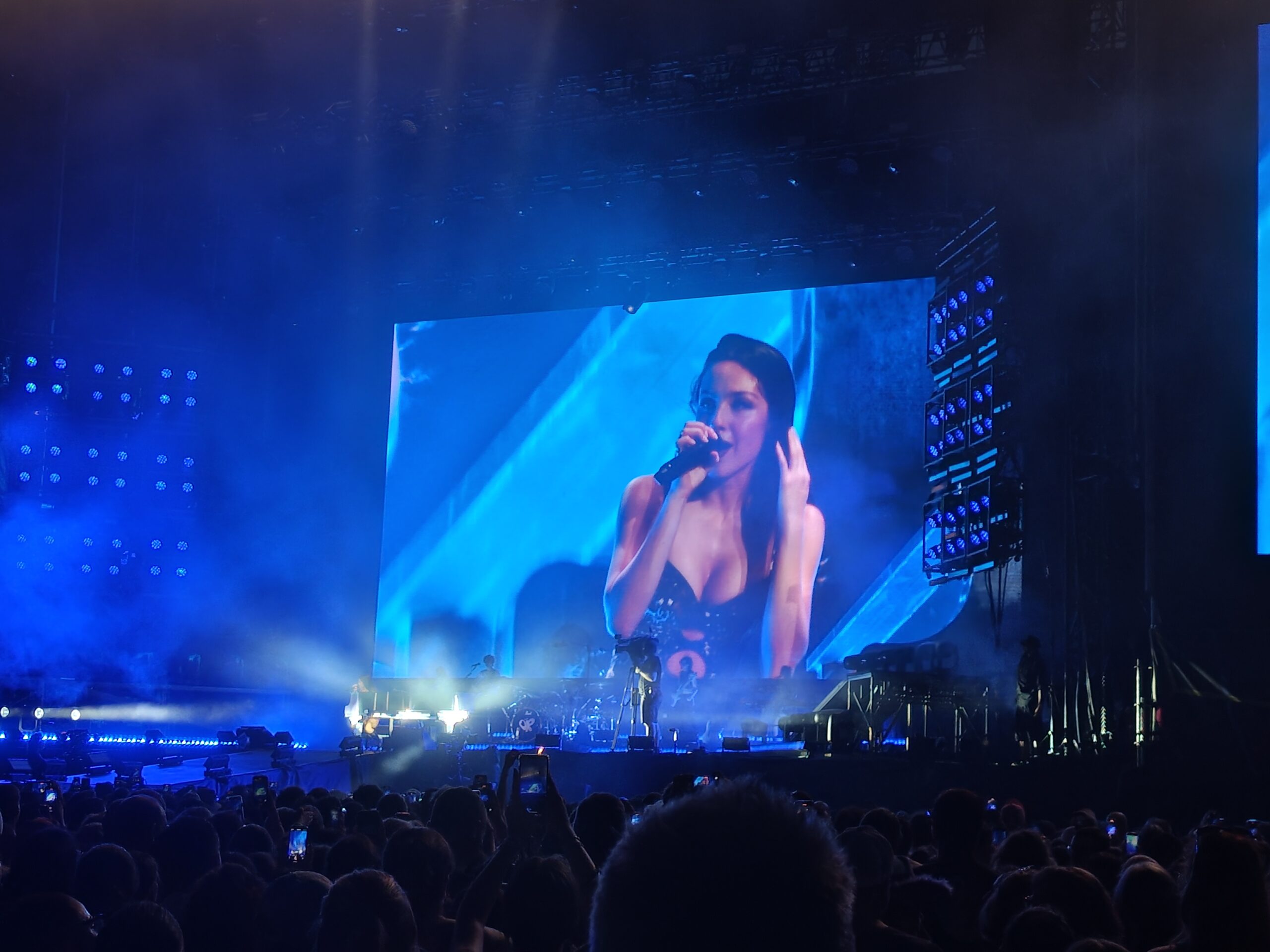Quando le luci si spengono e parte Obsessed, l’urlo collettivo che accoglie Olivia è più forte di qualsiasi intro. In corsetto leopardato e chitarra la cantante si muove sicura su un palco essenziale con dietro di lei un grande ledwall che fa da padrone disegnandola come protagonista assoluta di un videoclip continuo.