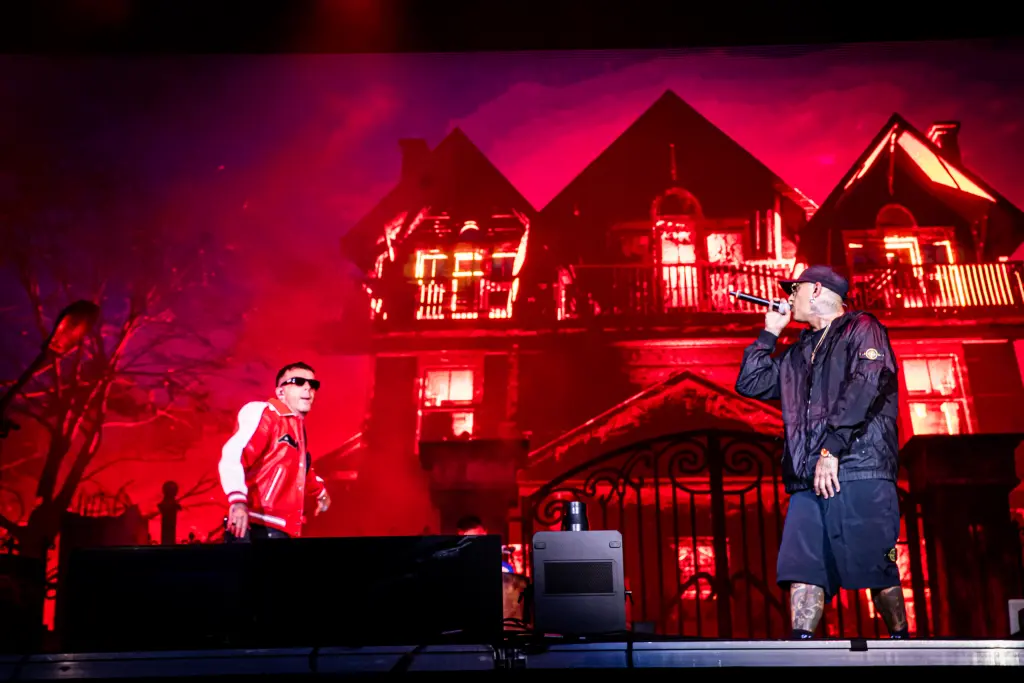 Oltre a Salmo e Noyz due dj e nessun musicista. Un set che richiamava l’immaginario del joint album, a partire dalla scenografia che proponeva un grande visual in cui si scaglia l’immagine di una casa degli orrori che andrà a fuoco e due schermi laterali che hanno alternato immagini in presa diretta del pubblico e degli artisti.