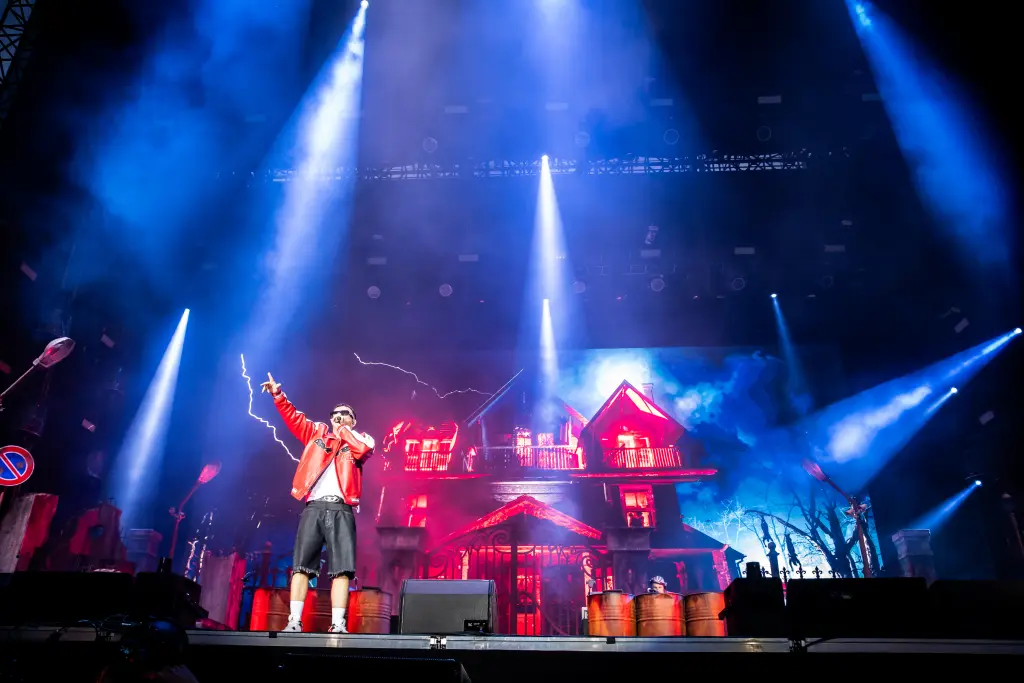 Oltre a Salmo e Noyz due dj e nessun musicista. Un set che richiamava l’immaginario del joint album, a partire dalla scenografia che proponeva un grande visual in cui si scaglia l’immagine di una casa degli orrori che andrà a fuoco e due schermi laterali che hanno alternato immagini in presa diretta del pubblico e degli artisti.