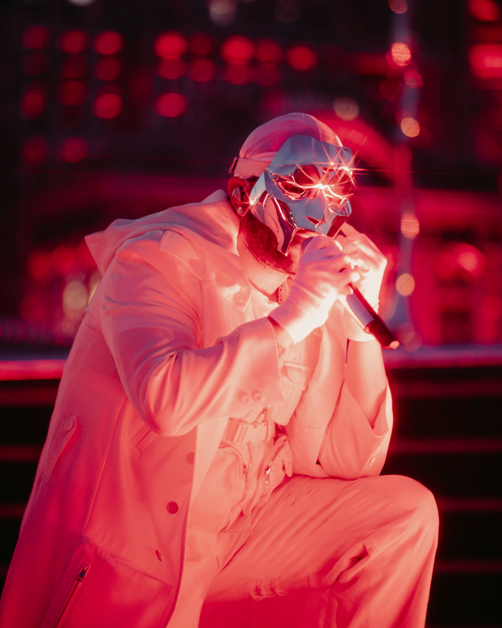 Dal palco parte una passerella che sarà lunga più di cento metri e nel mezzo una divinità argentata. Una cyborg immensa (realizzata da Hajime Sorayama) quasi come fosse un totem alieno che sovrasta il mondo di The Weeknd, mentre in fondo alla passarella un altro palco circolare e una immensa luna che illumina la notte.