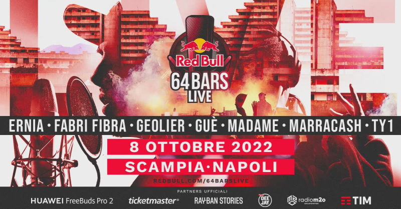 Red Bull 64 Bars Live non sarà un classico concerto, ma un evento fuori dagli schemi mai visto prima per la sua forma e originalità, uno show imperdibile concepito in un modo nuovo e non convenzionale che vedrà protagonisti ERNIA, FIBRA, GEOLIER, GUÈ, MADAME e MARRACASH, supportati dal dj TY1 in cabina di regia.