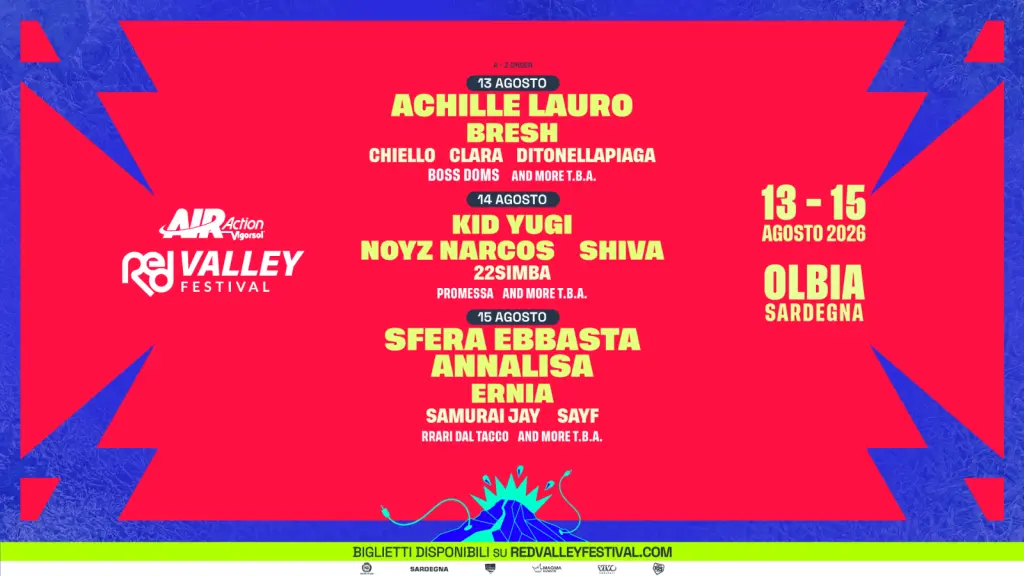 Achille Lauro ha scelto il Red Valley Festival come sua unica data estiva, dopo un anno di successi. Tra le new entry spiccano Sayf, con il nuovo album “Santissimo” in uscita l’8 maggio, Ditonellapiaga con “Miss Italia” e Chiello con “Agonia”, tutti reduci dal successo al Festival di Sanremo. Si aggiungono inoltre Boss Doms, come una nuova tappa del suo tour, insieme a Bresh e Clara, da anni tra gli artisti più richiesti dalla community del festival. Tra i grandi ritorni troviamo Shiva, tra i protagonisti più acclamati dell’edizione 2025, Annalisa, già headliner nel 2024 con uno spettacolo memorabile e 22Simba, che dopo aver aperto il festival nel 2024 tornerà quest’anno con un nuovo show.