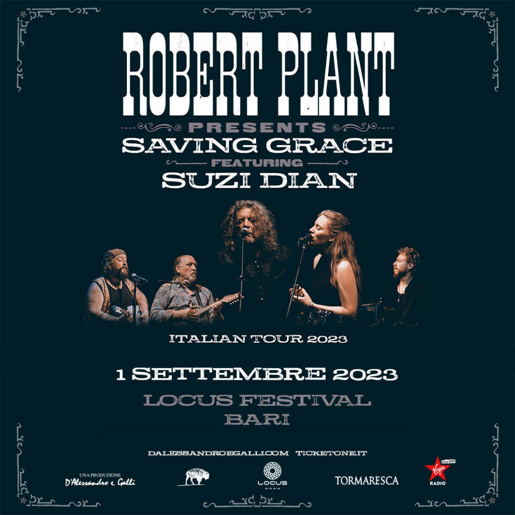 L’icona del rock, membro dei Led Zeppelin, porta al Locus Festival Saving Grace, il progetto che lo vede sul palco insieme a Suzi Dian (voce), Oli Jefferson (percussioni), Tony Kelsey (mandolino, baritono e chitarre acustiche), Matt Worley (banjo, chitarre acustiche e baritono, cuatro). Il gruppo arriva in Italia dopo il debutto nel 2019 con una serie di concerti a sorpresa in piccoli locali in Inghilterra, Galles e Irlanda e, successivamente, con tre date nel Regno Unito a sostegno della Fairport Convention.