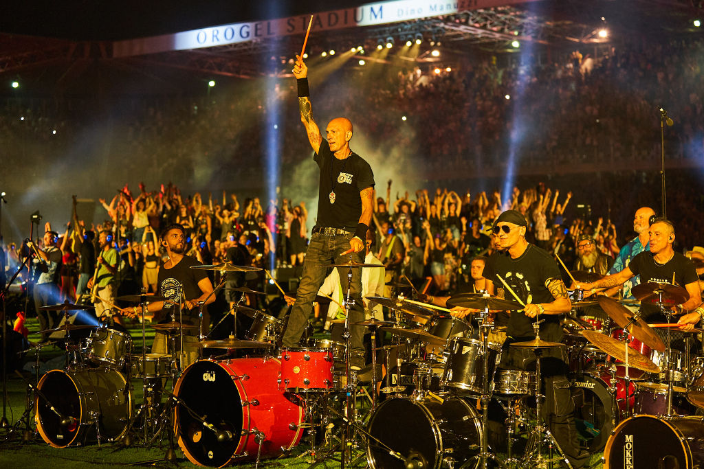 Mille musicisti hanno invaso lo stadio e hanno iniziato a posizionarsi accanto al proprio strumento per dare il via a questa serata evento tutta da vivere: attraverso due ore di show si sono ripercorse le canzoni che hanno fatto la Storia della Musica Rock, omaggiando così anche la natura tenace, viva e partecipativa dei romagnoli, che a migliaia si sono riversati nelle strade per aiutarsi l’un l’altro, durante quelle settimane di grande difficoltà. On stage 250 batteristi, 250 bassisti, 300 chitarristi, 45 tastieristi e oltre 200 voci hanno infiammato lo stadio di Cesena, sulle note dei brani più iconici dello scenario rock.
