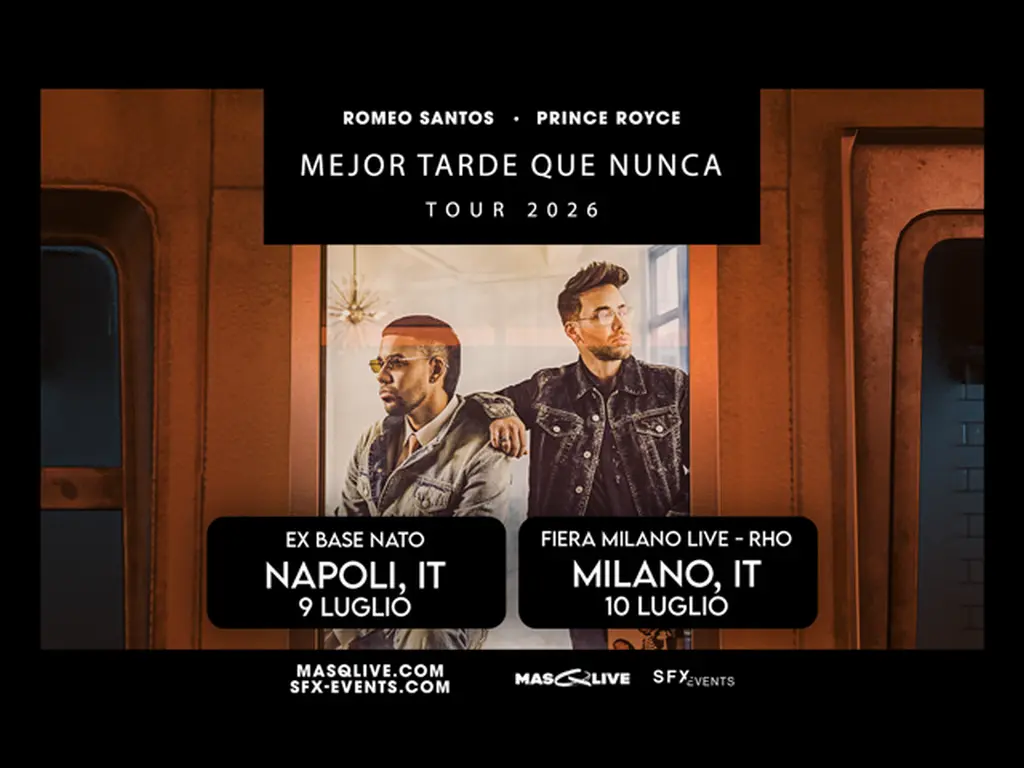 Due dei nomi più influenti e determinanti della bachata e della musica latina a livello mondiale, Romeo Santos e Prince Royce, annunciano ufficialmente il loro primo tour congiunto in Europa sotto il titolo “Mejor Tarde Que Nunca”, un evento senza precedenti per il genere e per il pubblico europeo.
