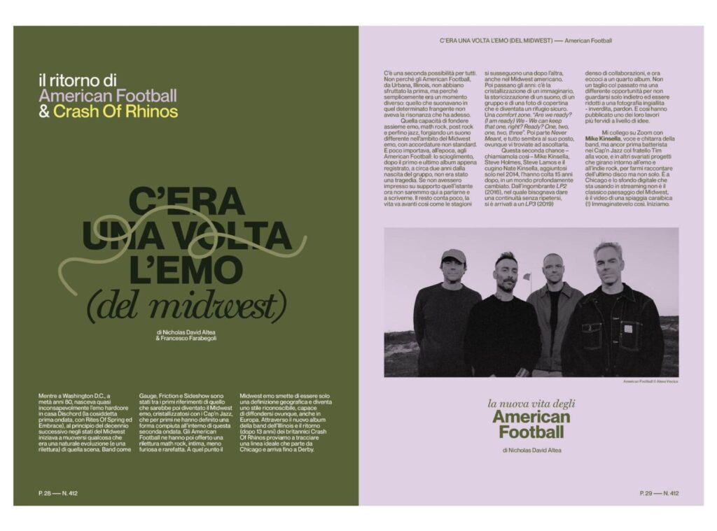 L’uscita concomitante dell’atteso quarto album di questi ultimi (LP4), il terzo post reunion, e di Logbook, nuovo lavoro – dopo una lunghissima pausa – dei britannici Crash Of Rhinos, che quel suono lo avevano importato – e rielaborato – con successo nel Regno Unito, ci offre l’occasione per tirare le somme su un fenomeno che oggi non ha smesso di dialogare con nuove generazioni di musicisti. Nicholas David Altea intervista approfonditamente Mike Kinsella degli American Football e i Crash Of Rhinos, oltre a ripercorrere le evoluzioni dell’emocore attraverso una discografia commentata; Francesco Farabegoli, in appoggio, ragiona ad ampio raggio su posterità, permanenza e attualità del Midwest Emo.