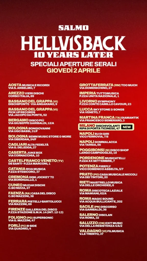 Poiché con Salmo ogni release è una vera esperienza da vivere, l’uscita di “HELLVISBACK 10 YEARS LATER” non poteva che essere festeggiata con un’iniziativa speciale: un momento pensato per i fan che vada oltre la musica per diventare rituale, celebrazione collettiva estesa a tutta l’Italia.