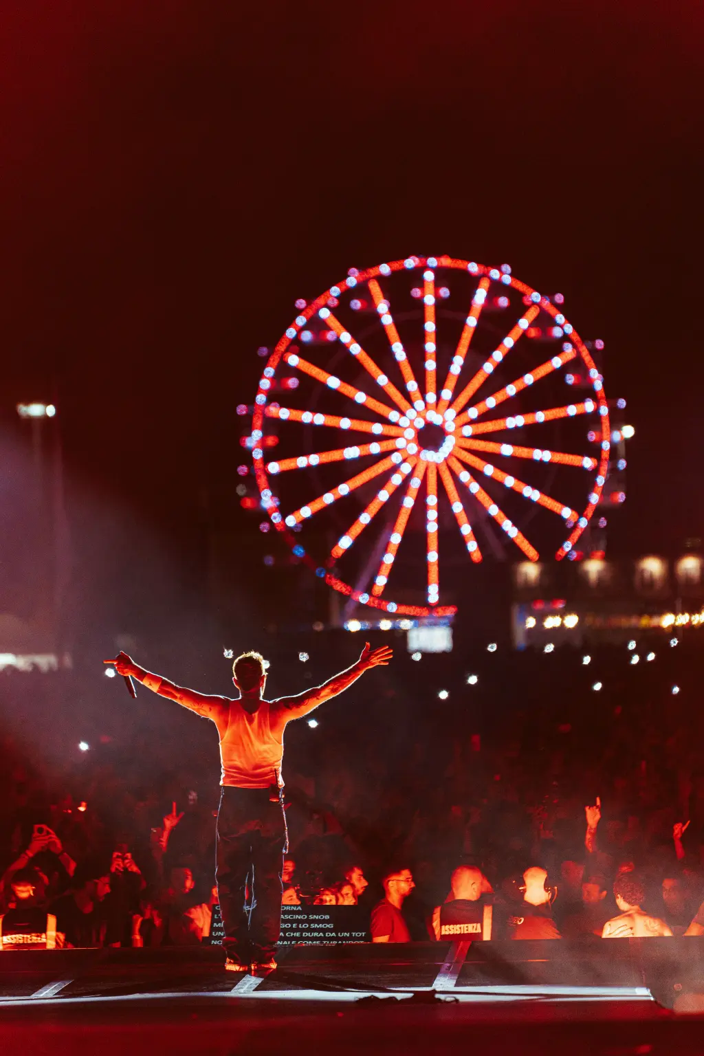Non un semplice concerto, ma un happening totale: un luna park a tema rap, pensato come festa collettiva per i fan. Ruota panoramica, scivoli giganti, cavalli da derby, tori meccanici, autoscontri e aree food & chill hanno scandito il pomeriggio, preparando il terreno a uno show che ha unito spettacolo e intrattenimento in un format senza precedenti.