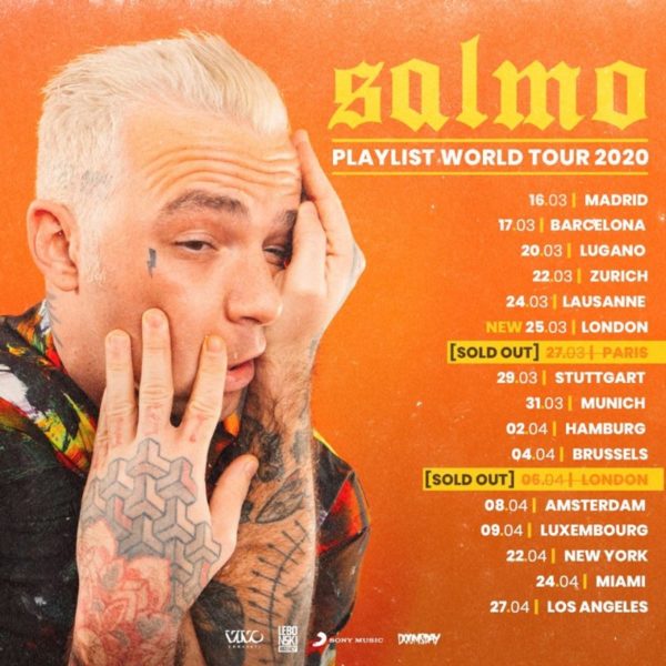 Tutto esaurito per le tappe di Parigi (venerdì 27 marzo a La Boule Noire), e di Londra (lunedì 6 aprile all’Electric Ballroom) del “PLAYLIST WORLDWIDE TOUR 20202” di Salmo.