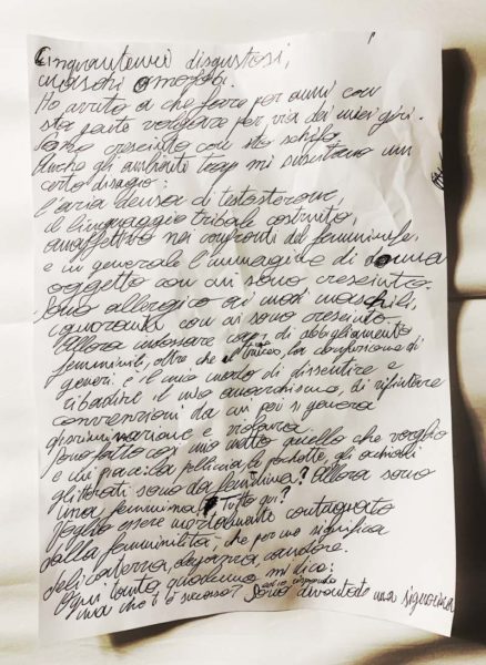 Cinquantenni disgustosi, maschi omofobi. Ho avuto a che fare per anni con ‘sta gente volgare per via dei miei giri. Sono cresciuto con ‘sto schifo. Anche gli ambienti trap mi suscitano un certo disagio: l’aria densa di finto testosterone, il linguaggio tribale costruito, anaffettivo nei confronti del femminile e in generale l’immagine di donna oggetto con cui sono cresciuto.