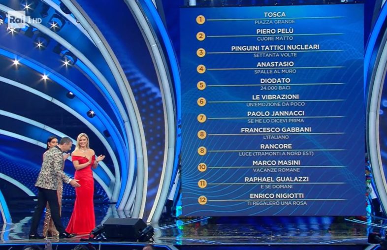 CLASSIFICA FINALE DELLA SERATA (formulata sulla base dei voti espressi dall’orchestra). Domani, a inizio puntata, i voti di questa classifica saranno sommati a quelli della classifica della demoscopica di ieri.