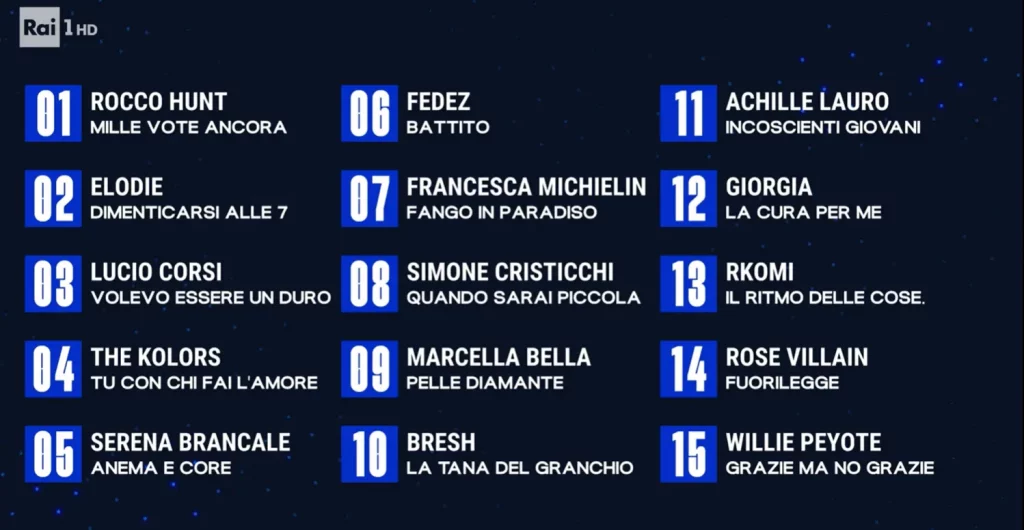 LA SCALETTA DELL’ESIBIZIONI DEI 15 BIG IN GARA