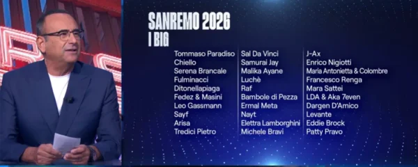 Il direttore artistico Carlo Conti in diretta all’interno del TG1 delle 13:30 ha svelato la lista dei 30 big che parteciperanno al 76° Festival di Sanremo, in programma da martedì 24 febbraio 2026 a sabato 28 febbraio 2026.