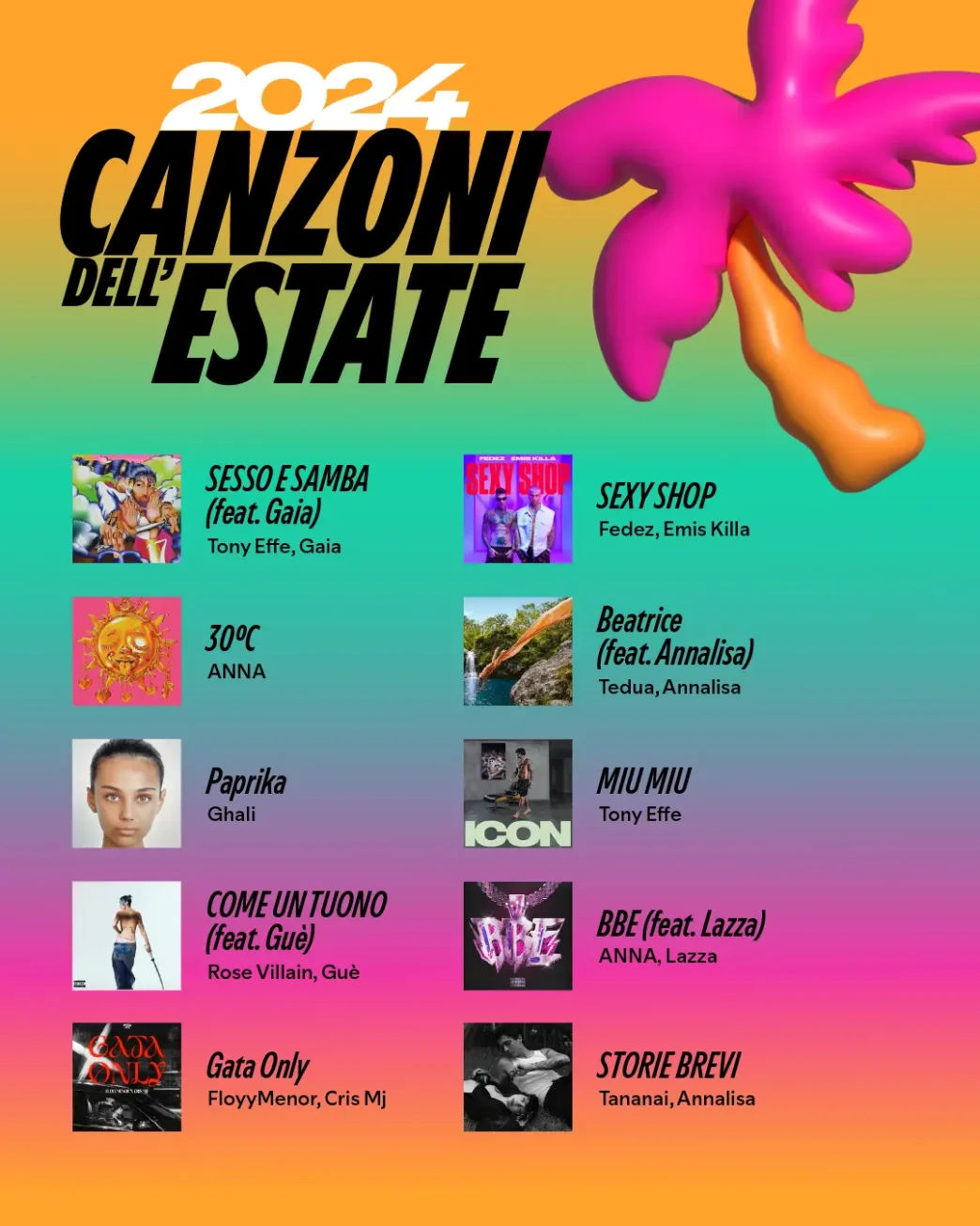 Al primo posto fra le canzoni più ascoltate dell’estate troviamo SESSO E SAMBA (feat. Gaia) di Tony Effe e Gaia, seguita da 30°C di ANNA, a conferma della forte presenza di artiste nella nostra top 10 di quest’anno. Terza hit della lista è Paprika di Ghali, posizionata immediatamente prima di una serie di collaborazioni vincenti come quella di Rose Villain con Guè per COME UN TUONO (feat. Guè) e di FloyyMenor con Cris Mj per GATA ONLY, unica traccia non italiana in top 10.