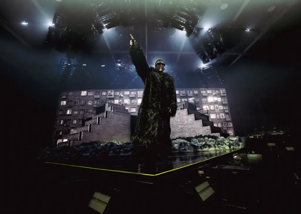 Il palco, imponente e strutturato su due livelli, è dominato da gradini luminosi a LED, cornice scenografica per Sfera e gli 8 ballerini, con coreografie curate dall’Head of Performance Laccio. Gli elementi visivi sono una parte integrante dello spettacolo: da pareti ispirate ai palazzoni di periferia che si riempiono di graffiti, alle colorate navate di una cattedrale con il rosone logato $€, fino a visual futuristici firmati da SUGO Design, proiettati su un enorme ledwall di 24 metri di larghezza.