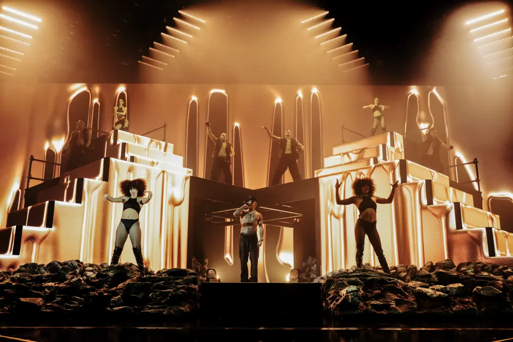 Il palco, imponente e strutturato su due livelli, è dominato da gradini luminosi a LED, cornice scenografica per Sfera e gli 8 ballerini, con coreografie curate dall’Head of Performance Laccio. Gli elementi visivi sono una parte integrante dello spettacolo: da pareti ispirate ai palazzoni di periferia che si riempiono di graffiti, alle colorate navate di una cattedrale con il rosone logato $€, fino a visual futuristici firmati da SUGO Design, proiettati su un enorme ledwall di 24 metri di larghezza.
