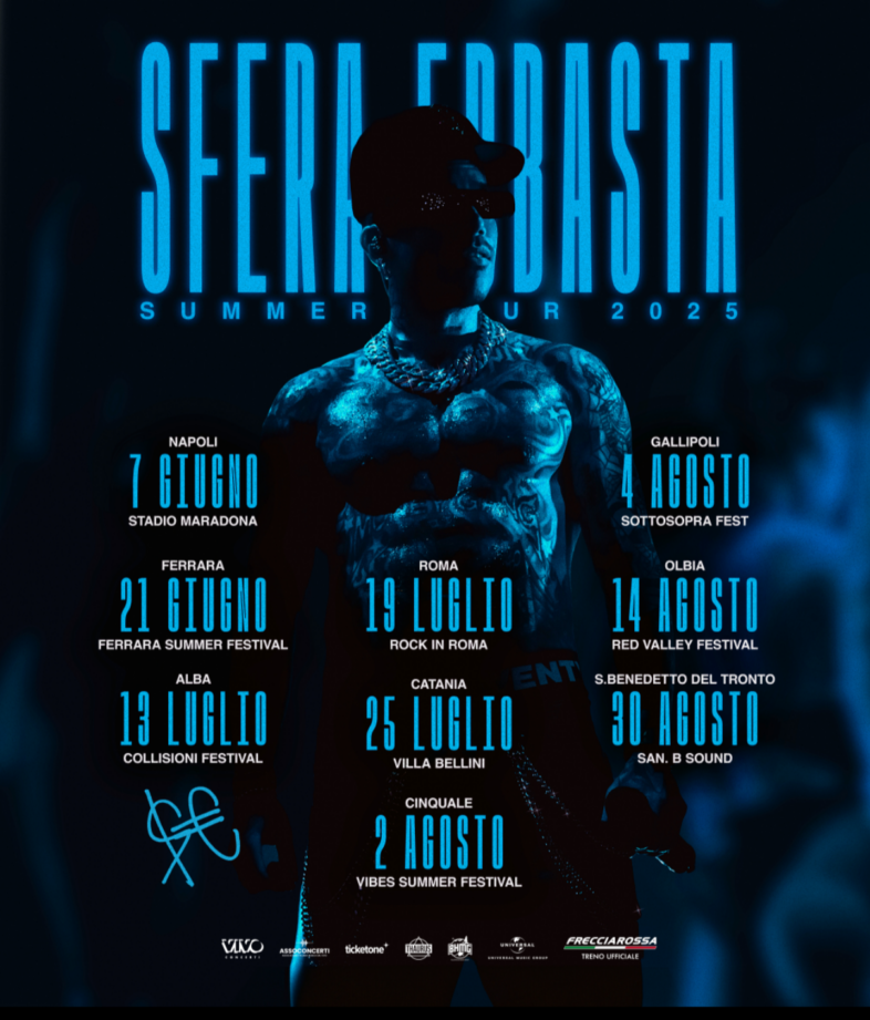 Sette le nuove date, nel cartellone delle più suggestive rassegne musicali a cielo aperto, che vanno ad aggiungersi alla già annunciata tappa di Roma, in programma il 19 luglio all’Ippodromo delle Capannelle per Rock in Roma: in estate Sfera Ebbasta toccherà anche le città di Ferrara, il 21 giugno @ FERRARA SUMMER FESTIVAL; Alba (CN), il 13 luglio @ COLLISIONI FESTIVAL; Catania, il 25 luglio @ Villa Bellini; Cinquale (MS), il 2 agosto @ VIBES SUMMER FESTIVAL; Gallipoli (LE), il 4 agosto @ SOTTOSOPRA FEST; Olbia (SS), il 14 agosto @ RED VALLEY FESTIVAL; San Benedetto del Tronto (AP), il 30 agosto @ SAN.B SOUND.