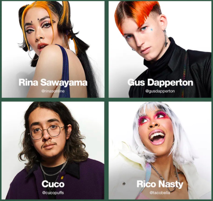 Quattro artisti emergenti si sono uniti alla campagna per rappresentare un’ampia gamma di stili musicali e prospettive sul mondo: la rapper Rico Nasty, il cantautore latino Cuco, il cantante e compositore di musica indie-pop Gus Dapperton e la sensazione pop londinese Rina Sawayama.