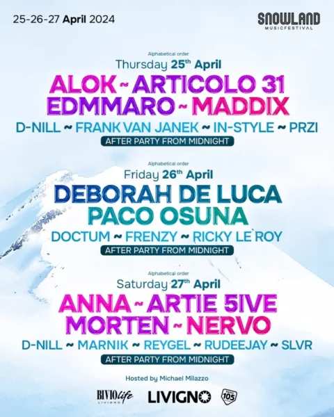Parte oggi, 25 aprile, il SNOWLAND LIVIGNO MUSIC FESTIVAL. Tre giorni di festival da oggi fino a sabato 27 aprile 2024 nella splendida cornice di Livigno (SO).