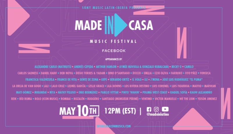 Sony Music Latin-Iberia annuncia un grande festival in streaming che porterà la musica direttamente nelle case dei fan, al fine di rinforzare e supportare il messaggio di prevenzione e distanziamento sociale per la lotta al COVID-19: Made In: Casa #DesdeCasaConMusica Music Festival!