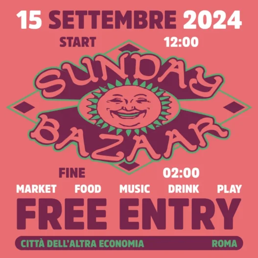 Sunday Bazaar, prodotto e realizzato da Lovegang Brand, presenta domenica 15 settembre 2024 una giornata di cultura, mercato, musica, cibo e workshop con ingresso gratuito dalle ore 12.00 alle 02.00 presso la Città dell’Altra Economia a Roma.