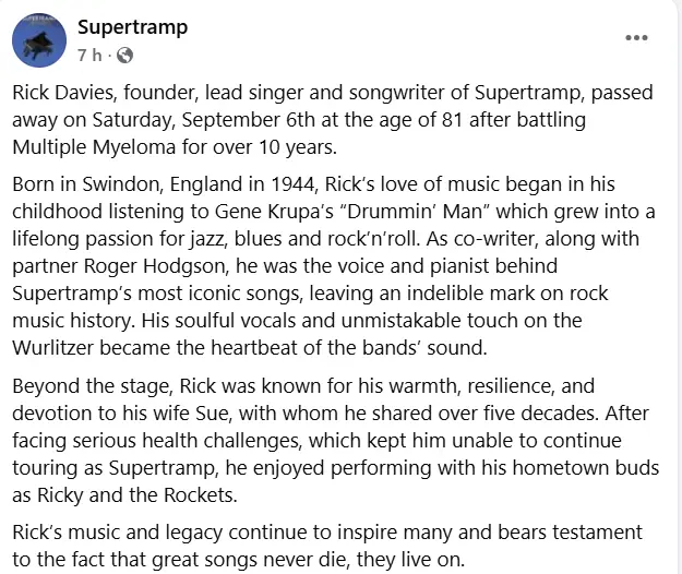 Davies era stato diagnosticato nel 2015 con un mieloma multiplo, condizione che lo aveva costretto a interrompere i piani per un tour europeo di reunion. Autore e voce di brani come Goodbye Stranger e Bloody Well Right, è stato il cuore sonoro e poetico dei Supertramp, band simbolo del rock britannico degli anni ’70 e ’80.