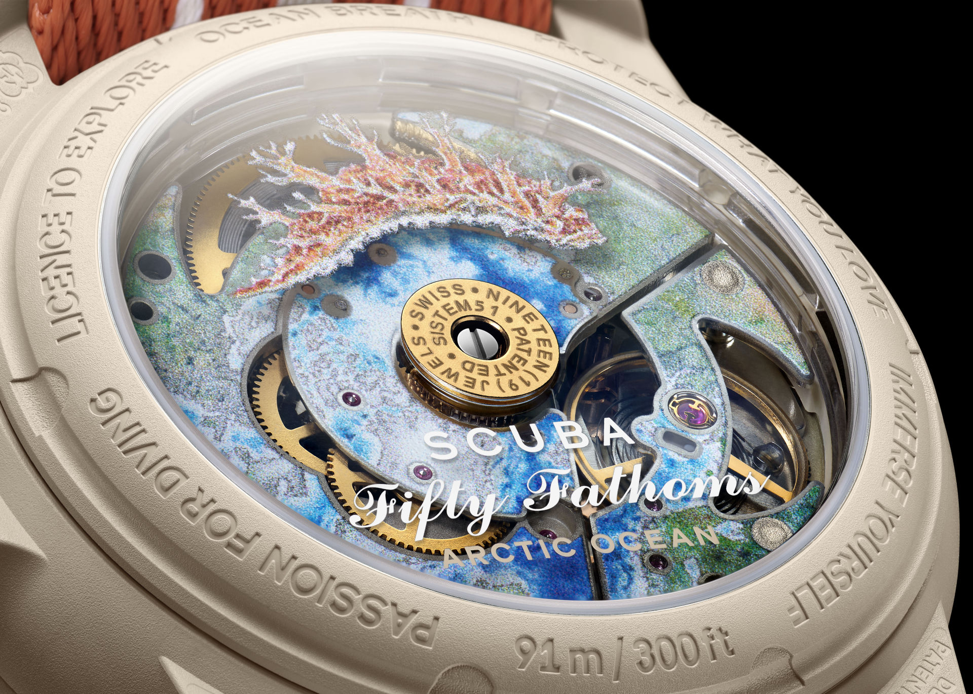 In linea con questa idea, il retro di tutti e cinque i modelli presenta l’illustrazione di magnifici e colorati molluschi presenti in tutti e cinque gli oceani: nudibranchi (nome scientifico: Nudibranchia). Questi animali sono raffigurati in una stampa digitale sul rotore del movimento.