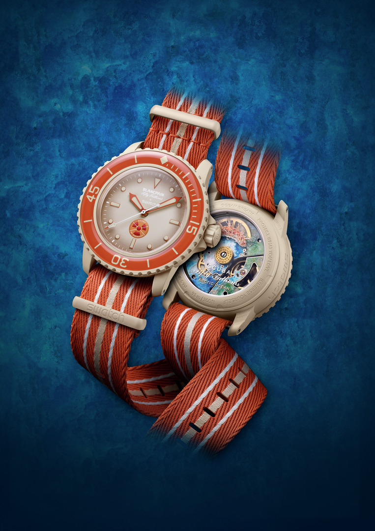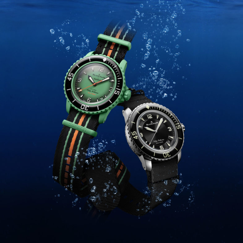 Con la nuova collaborazione Swatch rende omaggio a quest’icona grazie a cinque nuovi modelli, sempre restando fedele a sé stessa in modo divertente e giocoso. Denominata Bioceramic Scuba Fifty Fathoms, la collezione fa riferimento agli orologi subacquei del marchio, la linea SCUBA. Gli orologi di questa collezione non limitata riproducono fedelmente tutti gli elementi distintivi della collezione Fifty Fathoms: grande impermeabilità, leggibilità eccezionale, movimento meccanico, lunetta girevole con meccanismo