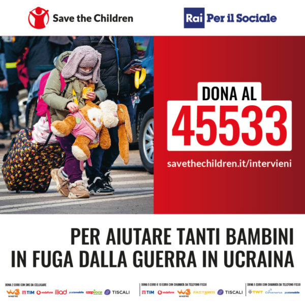 L’Iniziativa, che ha il supporto di Rai per il Sociale, è volta a raccogliere fondi per SAVE THE CHILDREN, che lavora in Ucraina dal 2014 e che distribuisce aiuti sia ai bambini e alle loro famiglie tuttora nel Paese, che a quelli che sono fuggiti nei paesi limitrofi. Tutti possono contribuire donare 2 euro con un sms al 45533 dal proprio cellulare e 5 o 10 euro chiamando lo stesso numero da rete fissa. Si può inoltre dare il proprio contributo attraverso il sito internet www.savethechildren.it/ucraina