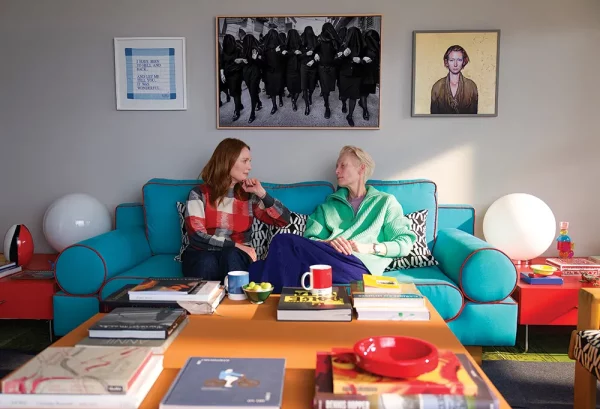 La Stanza Accanto è tuttavia un film privo di melodramma, i dialoghi sono sempre asciutti e la regia segue sempre questa precisa scelta artistica per tutto il film; tuttavia non è un film privo di poesia: come negli altri film del regista ci sono i colori, i riferimenti all’arte (Hopper) e all’architettura ( Lloyd Wright) con la stupenda casa nel bosco. La storia viene portata avanti Tilda Swinton e Julian Moore che firmano una prova attoriale di straordinaria sintonia oltre nel totale binarismo estetico che le mostra quasi come opposti in attrazione.