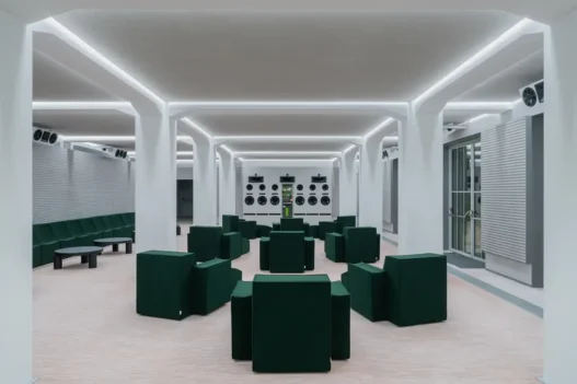 Per adattarsi a diversi scenari e forme d’uso, il designer britannico-canadese Philippe Malouin ha progettato su misura per Voce un sistema componibile di sedute in feltro con cuciture a vista, prodotto da Meritalia. Creando un lungo divano su una delle pareti laterali e prevedendo postazioni d’ascolto fatte di poltrone e divani, al centro dello spazio, o piccoli salotti lungo il perimetro dello spazio.