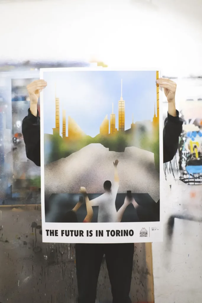 L’artista ha realizzato per il KFF un’opera esclusiva – riprodotta su 111 poster disponibili in edizione limitata – dal titolo “The Futur is in Torino”.